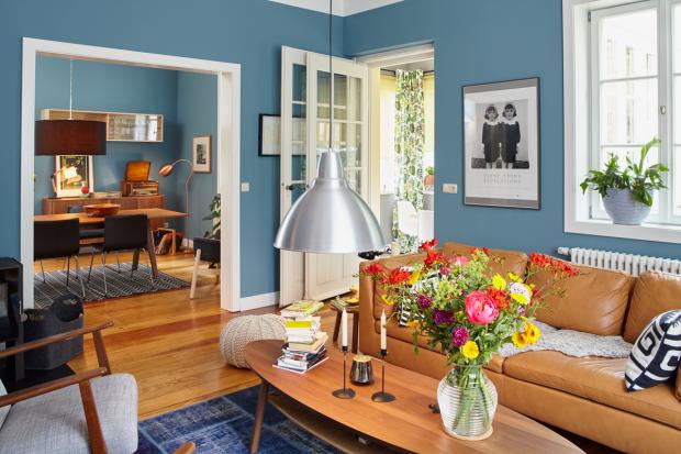 入口处的客厅是房屋整体风格的基调,富有生活情趣的Katrin让冷暖色在居室中得以完美融合。加上良好的采光让客厅与会客厅看起来更为通透和敞亮,蓝色与焦糖色的搭配也更显亲和力。