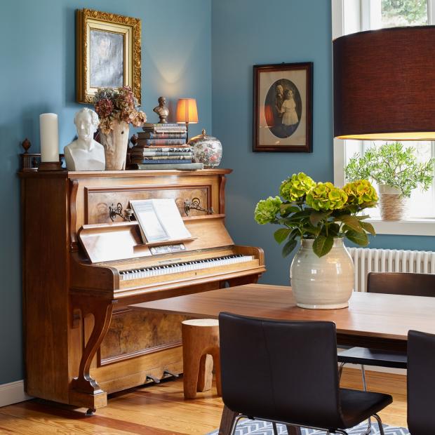 在改造期间,夫妇两也保留了很多极富有历史感的惊喜,例如古董炉灶,壁画,甚至还有传送食品的电梯。而眼前的钢琴也有了超过百年的历史。充满历史感的钢琴与现代活力的蓝色墙面搭配,一起演奏当下的幸福乐章。