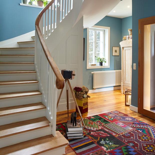 玻璃填充的木窗让光线柔和的撒进大厅。 拐角的木质楼梯与墙壁温柔的蓝色相辉映,居室的柔美缓缓融入生活。